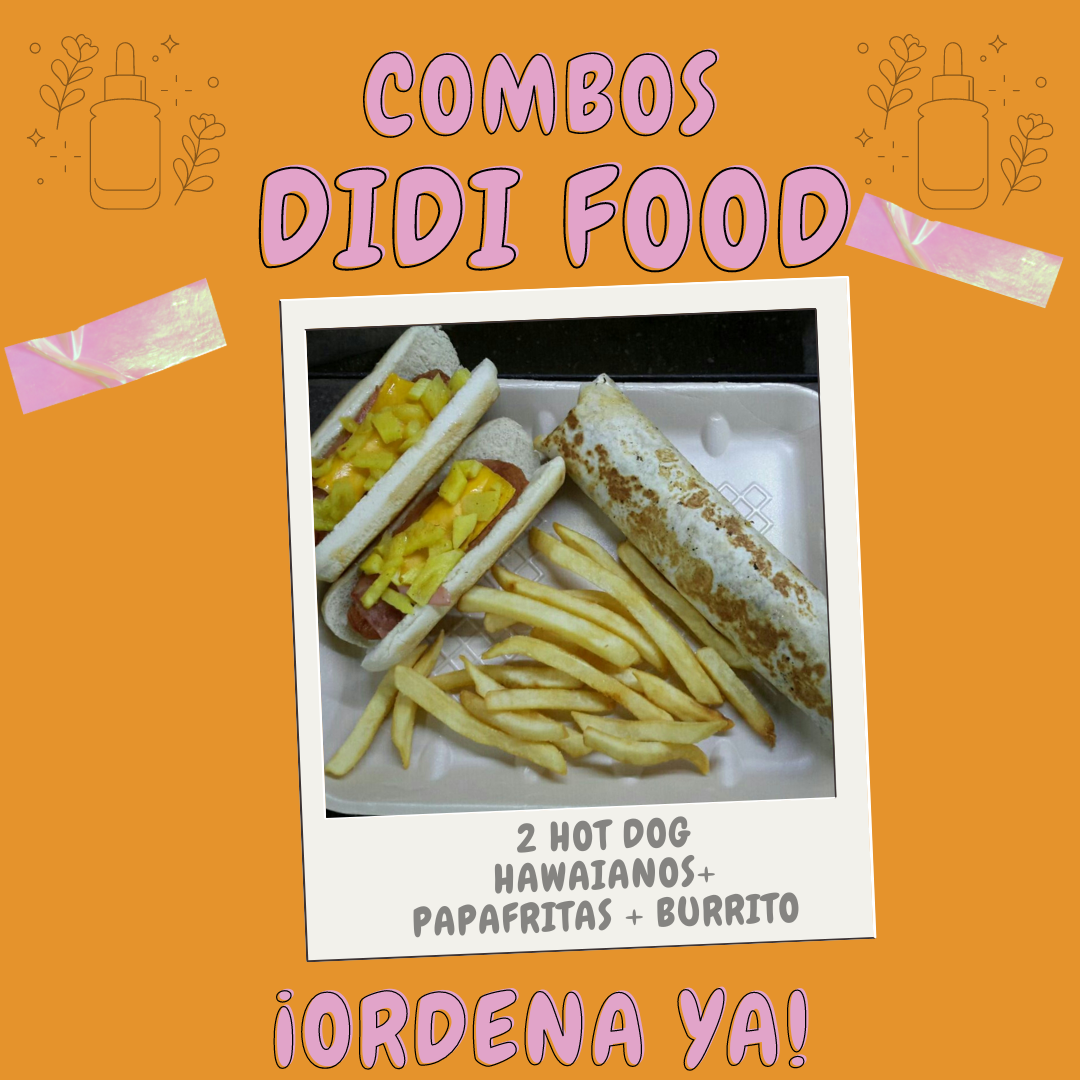 Un burrito de pierna adobada, 2 hot dog hawaiano. Una orden de papas.