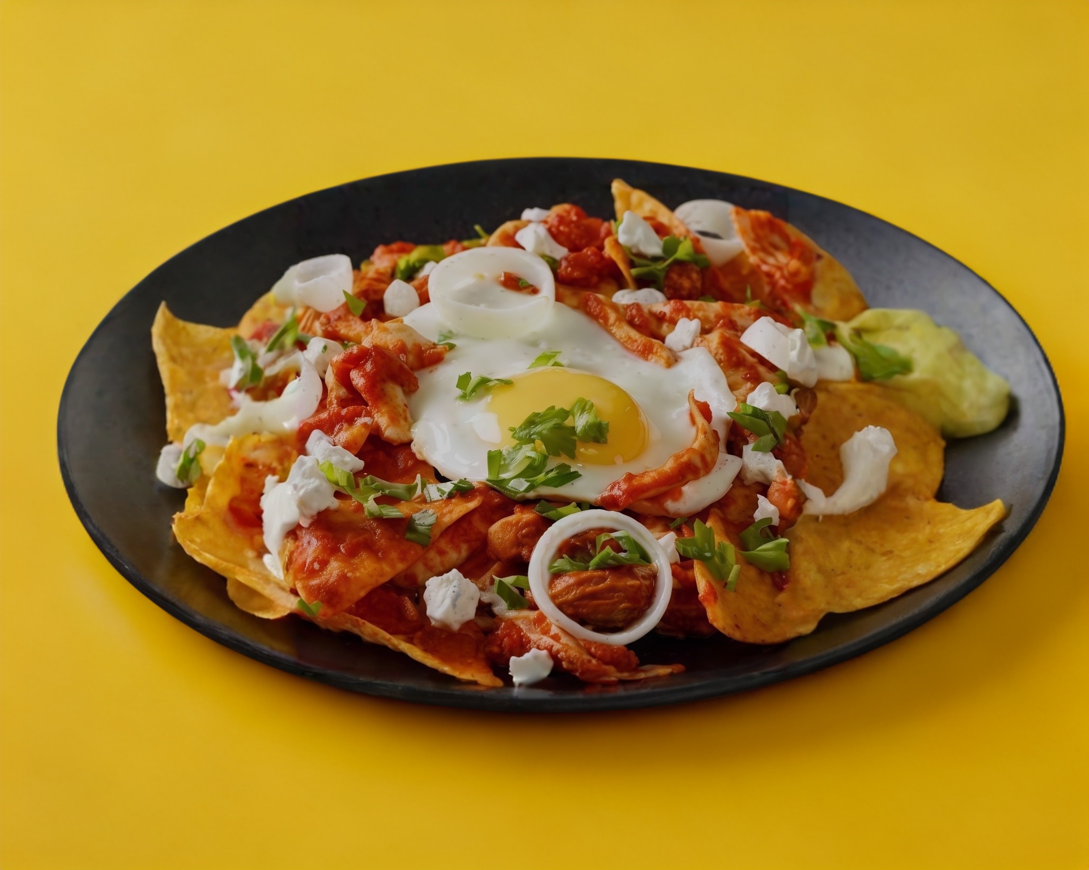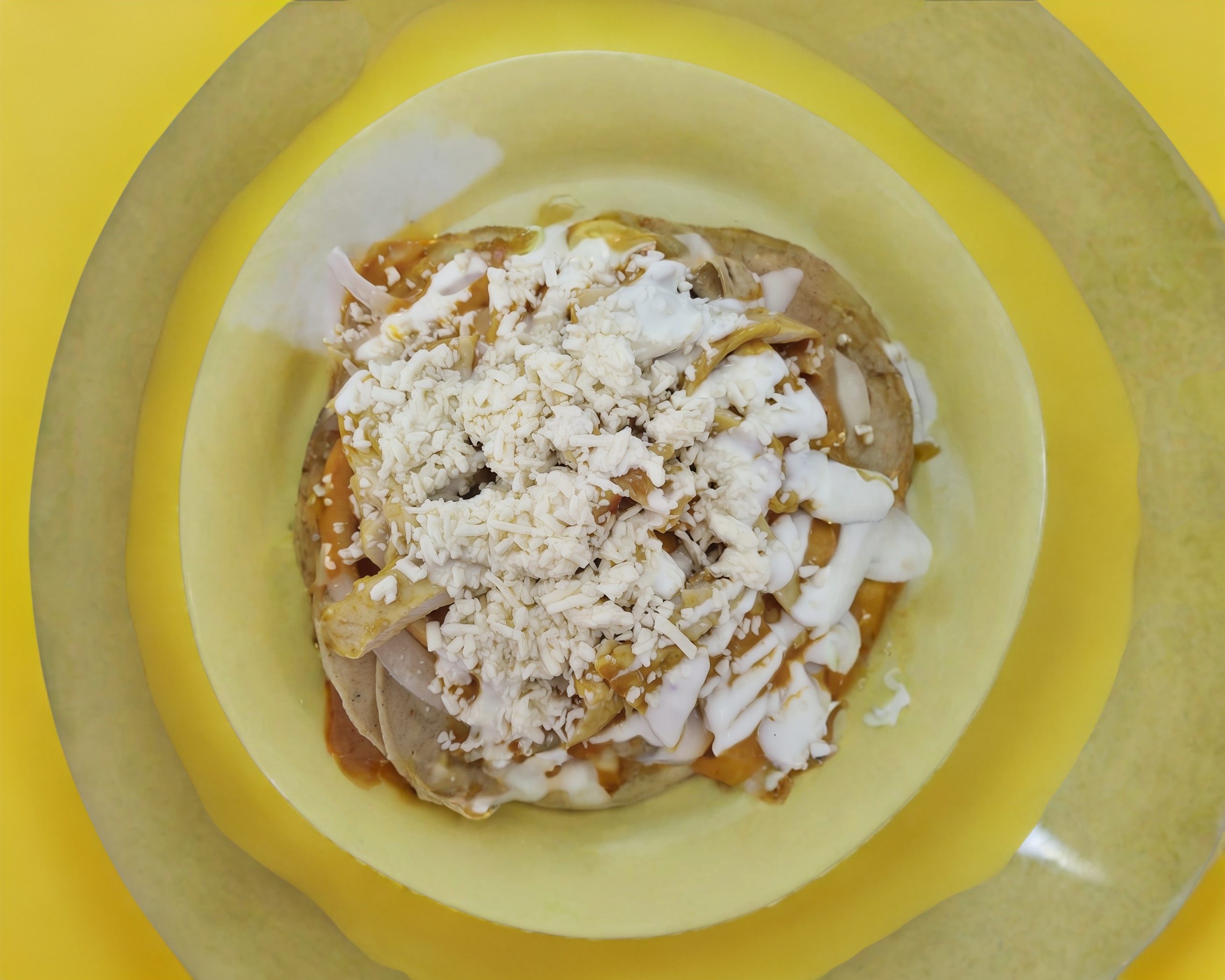 Crujientes totopos bañados de salsa roja con huevo pollo crema queso