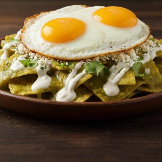 Crujientes totopos bañados de salsa verde acompañados de huevo y pollo