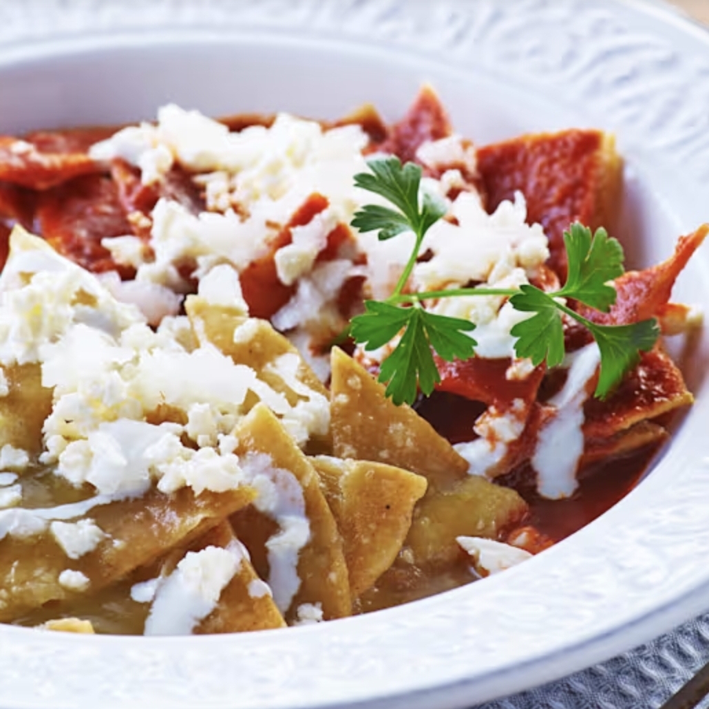 Crujientes totopos bañados con salsa verde y roja acompañadas de pollo