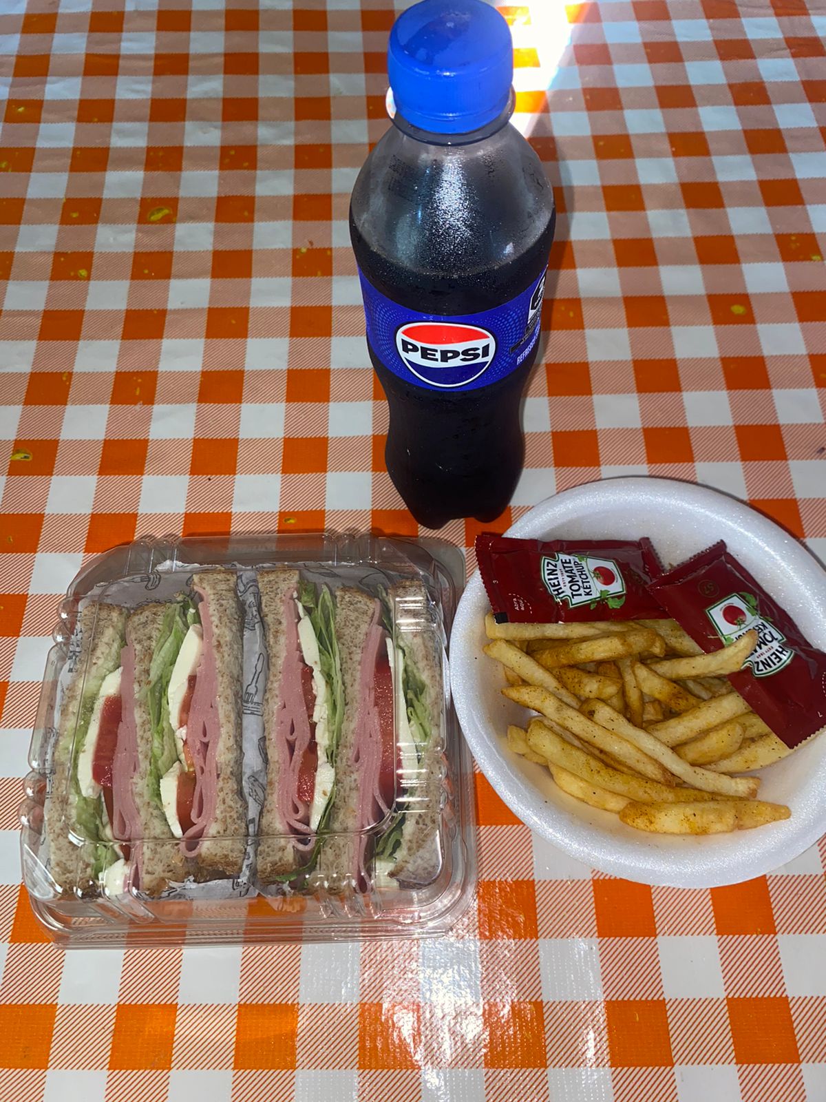 Sandwich de jamón con queso panela, lleva mayonesa, lechuga, jitomate, 3 tapas de pan, picante aparte. Orden de papas y refresco 400ml.