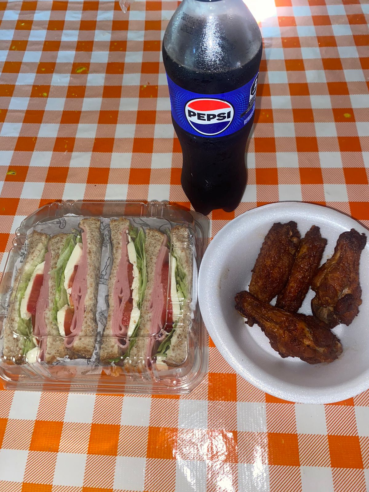 Sandwich de salchicha con queso panela, lleva mayonesa, jitomate, lechuga, 3 tapas de pan, picante aparte. incluye 4 Alitas o boneless y refresco 400ml.
