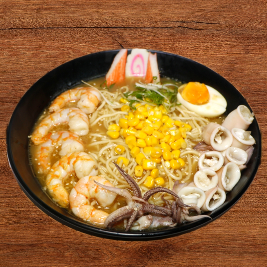 Pasta base ramen, mariscos, surimi, naruto, huevo, elote, cebollín, col, ajonjolí y nuestro caldo especial.