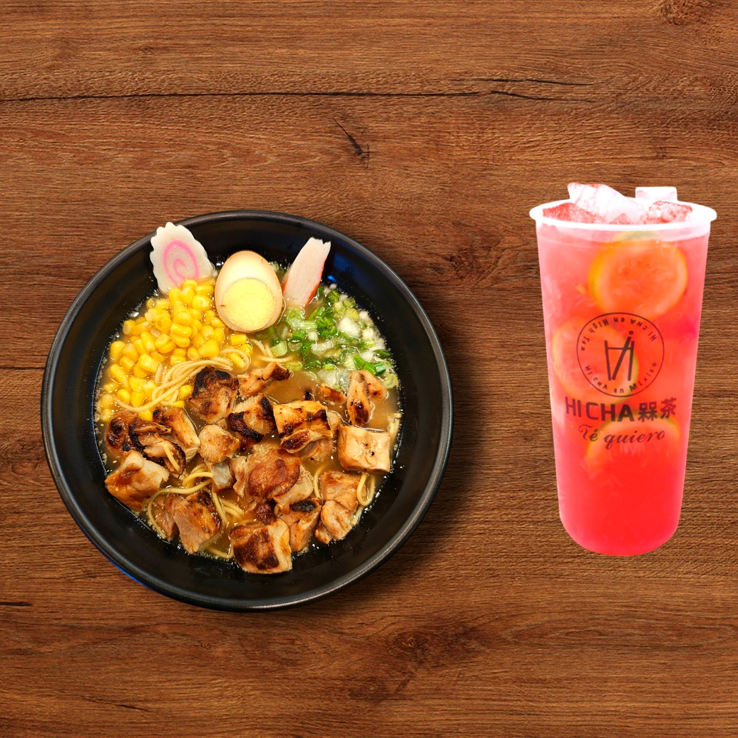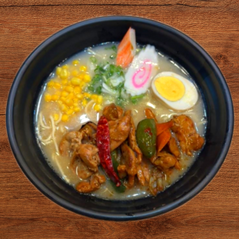 Pasta base ramen, pollo picante, surimi, naruto, huevo, elote, cebollín, ajonjolí y nuestro caldo especial..