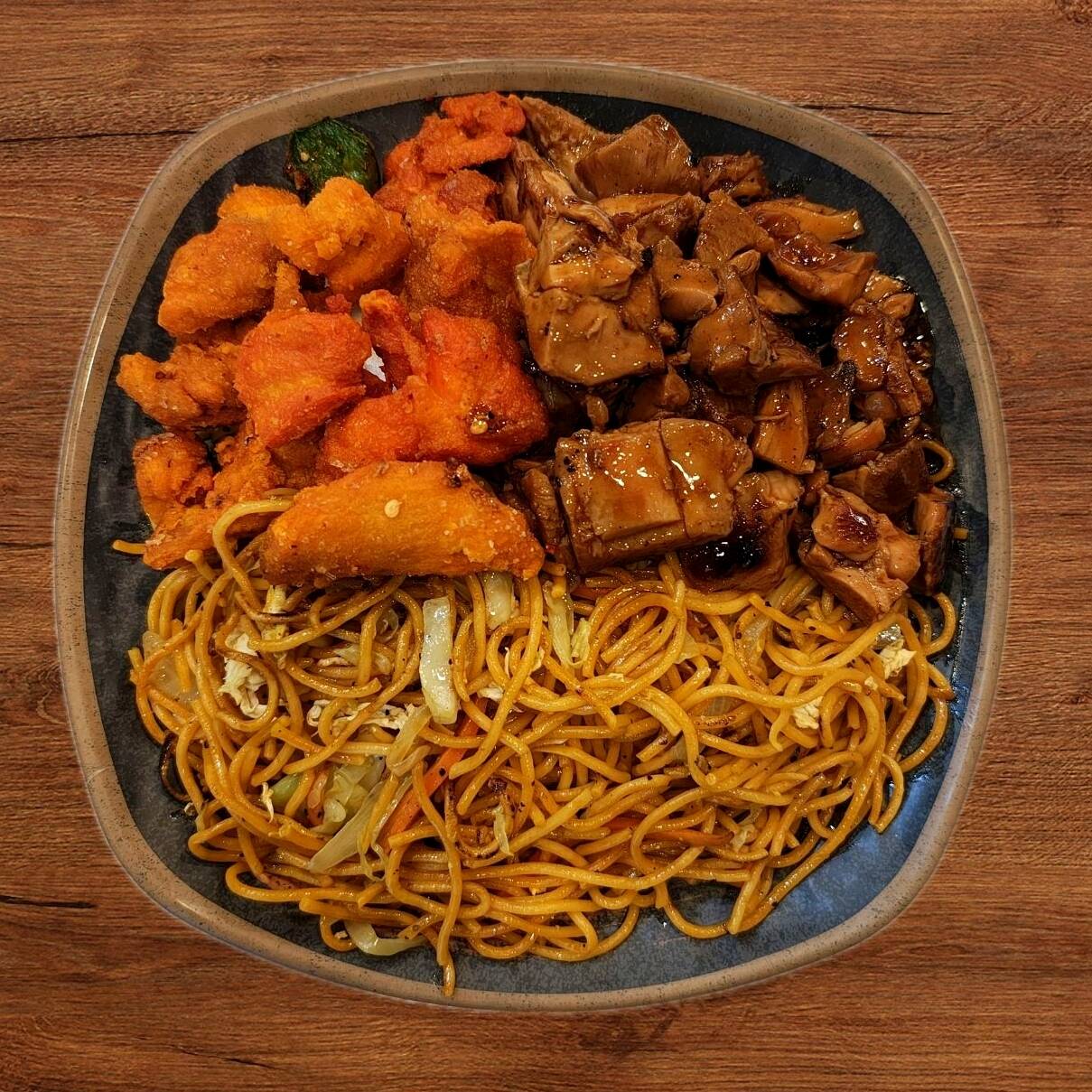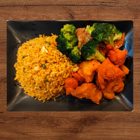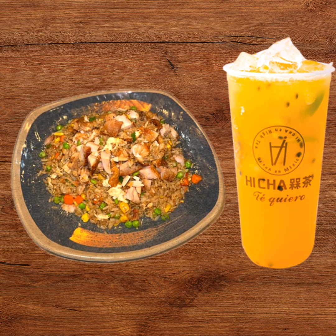 Arroz frito con pollo y té verde con maracuyá y limón.