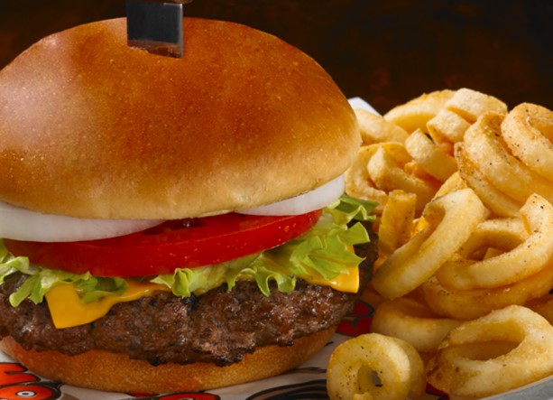 Hamburguesa de res con tocino, queso cheddar, onion ring y salsa BBQ. Servida con curley fries o side salad.