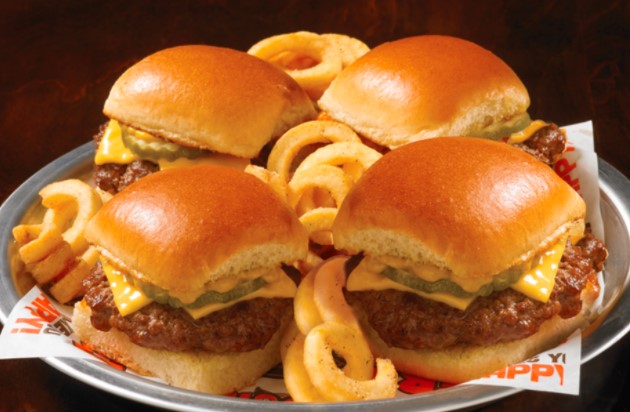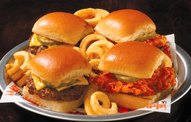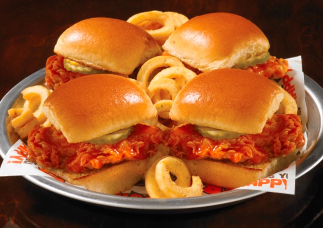 4 Hamburguesas miniatura de pollo empanizado, cubierto con tu wing sauce preferida. Las servimos con curley fries.