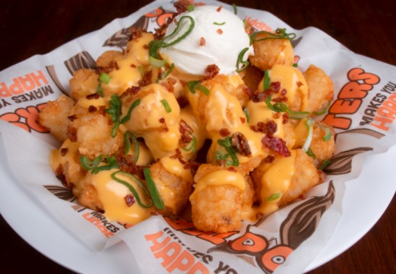 Bolitas de papa cubiertas con salsa de queso, tocino, crema ácida y cebollín picado.