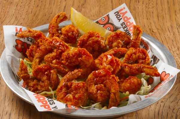 Camarones empanizados abiertos en mariposa y cubiertos con nuestra famosa wing sauce.