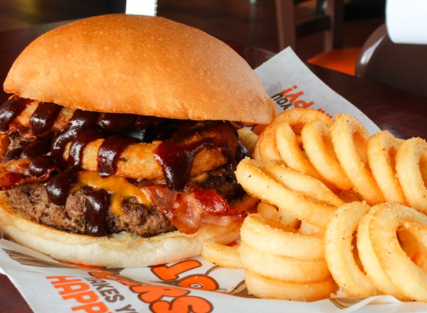 Como un vaquero en las vacaciones de primavera. Hamburguesa con cebolla caramelizada, salsa Daytona Beach, tocino y queso cheddar, servida en pan texas.