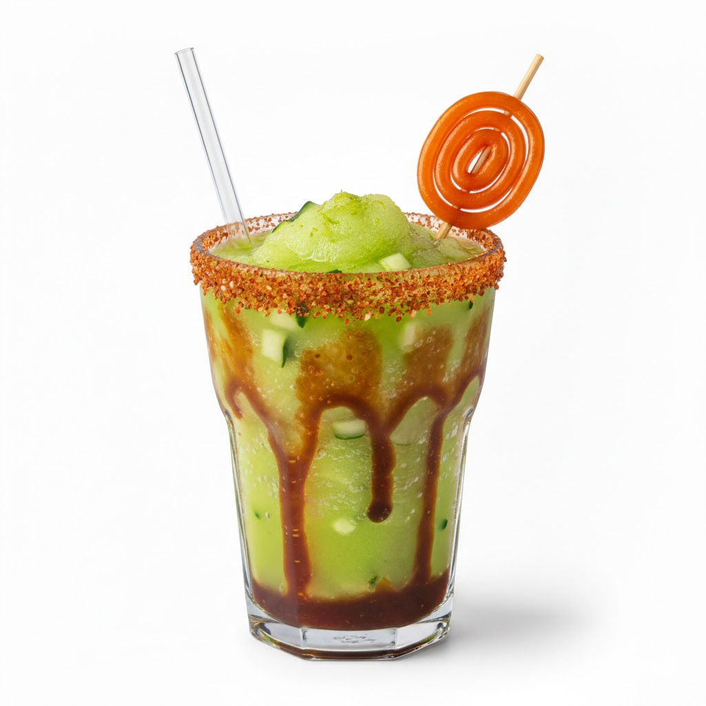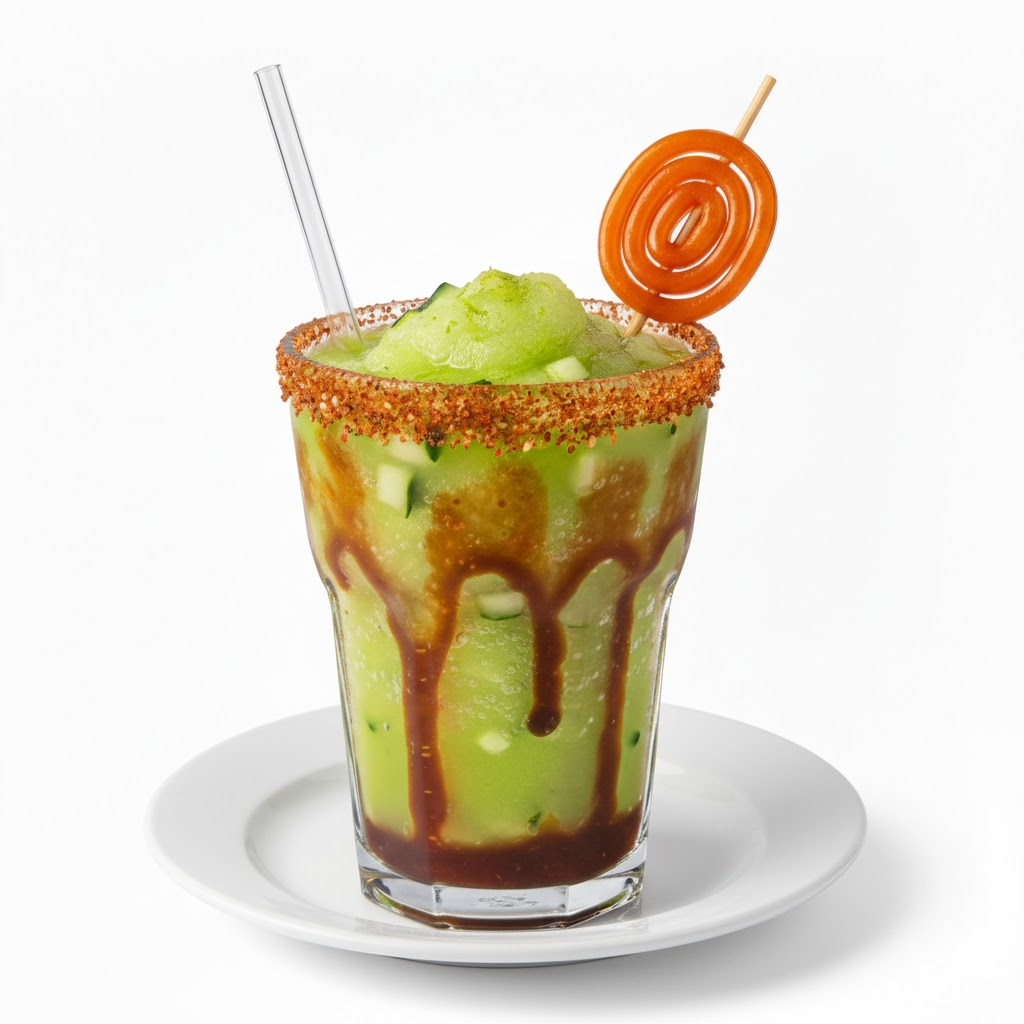 Deliciosa chamoyada de PEPINO-LIMON con jarabe de pelón y miguelito acompañado de su banderilla.