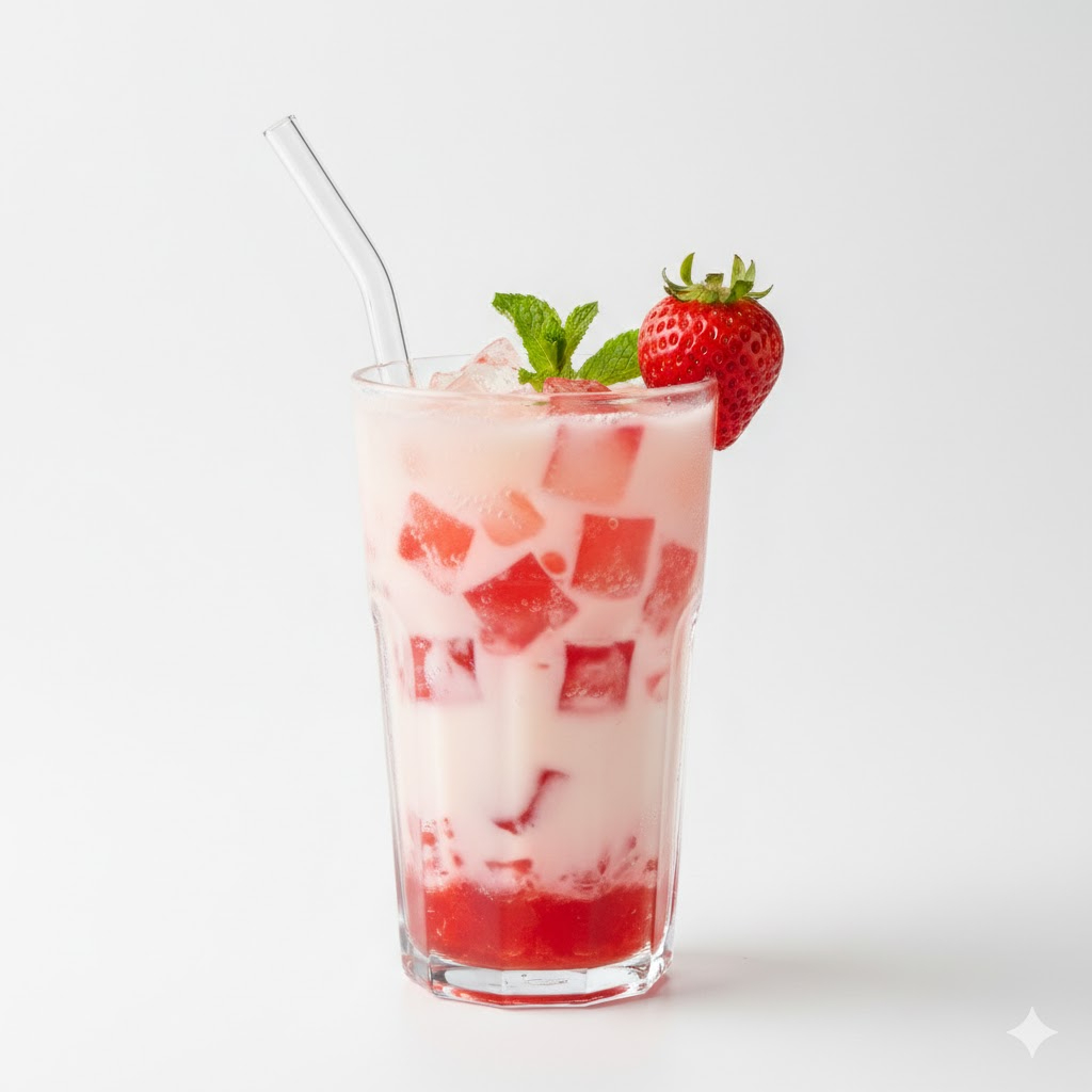 Refrescante bebida hecha a base de pulpa de fresa, agua mineral, perlas explosivas y limón.
