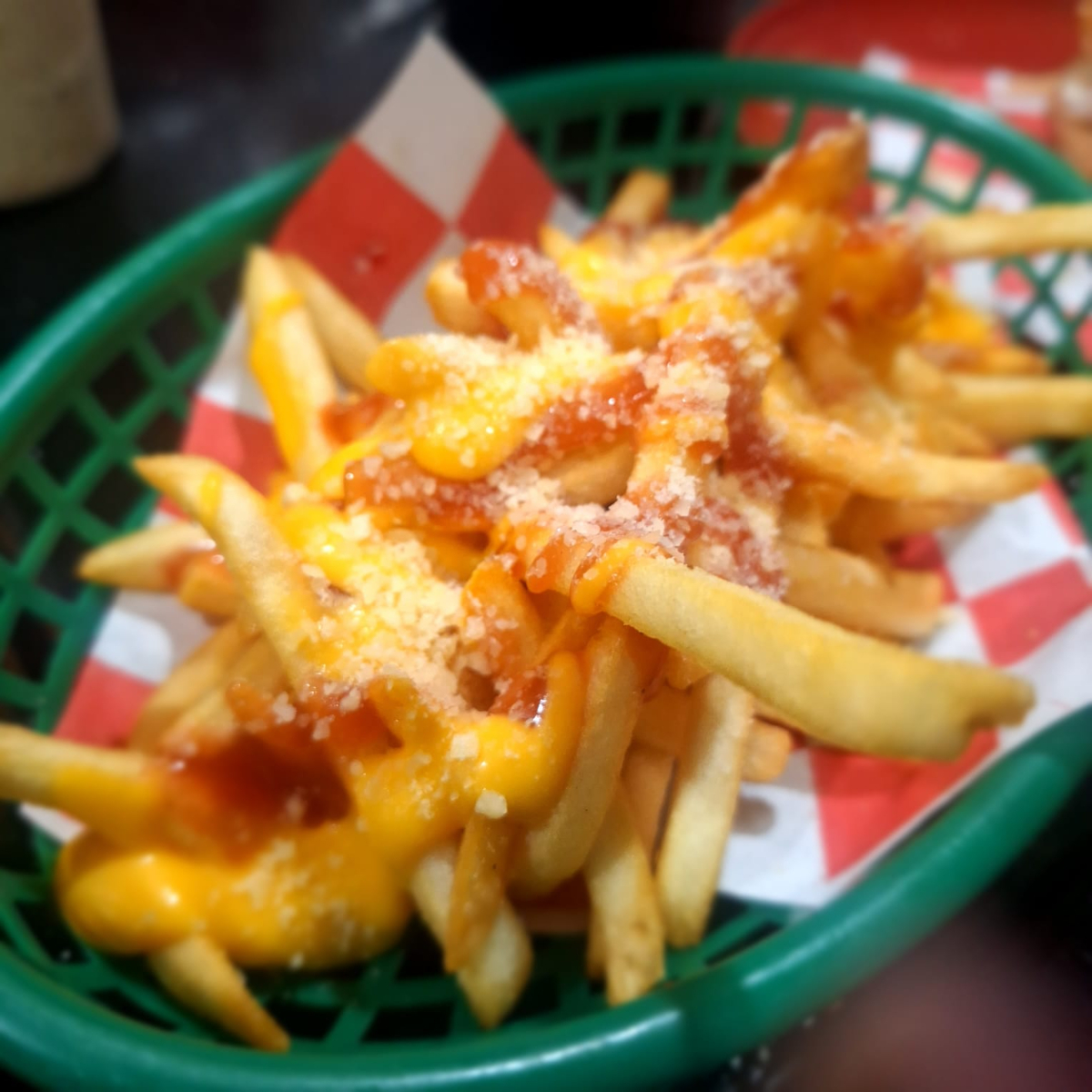 Salchicha de pavo, mayonesa, catsup, mostaza, cebolla caramelizada, queso Oaxaca.