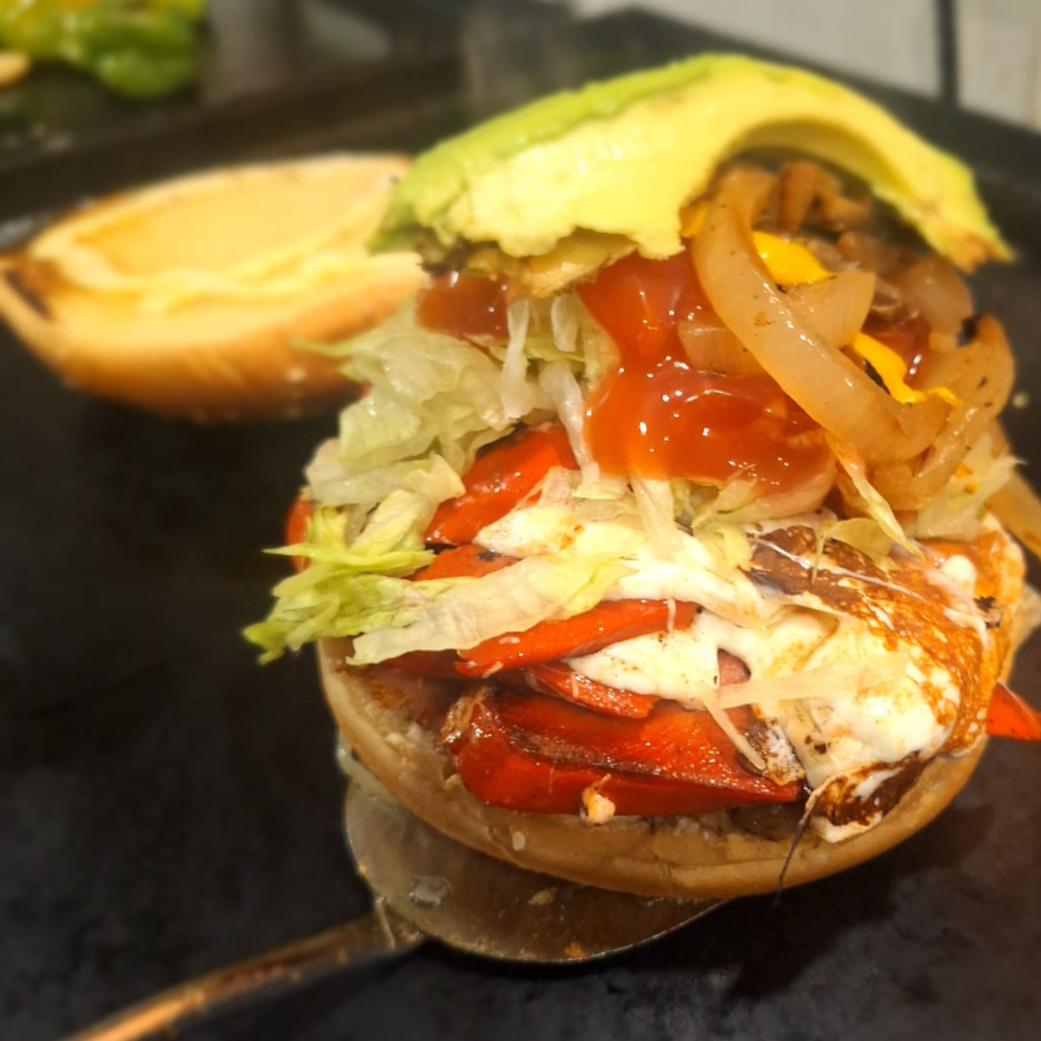 Carne 100% casera, jamon, queso amarillo, queso oaxaca, champiñones, mayonesa, catsup, mostaza, lechuga, tomate, cebolla caramelizada, aguacate.