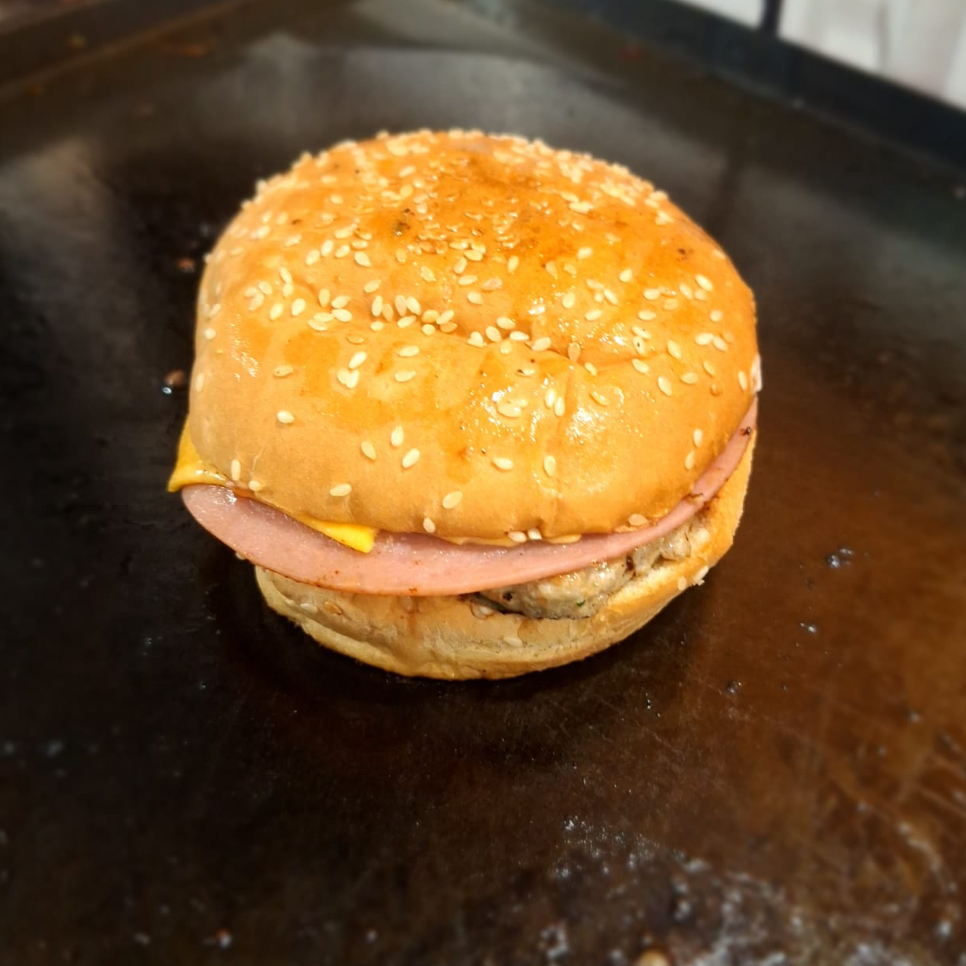 Carne 100% casera, jamón, queso amarillo, lechuga, tomate, cebolla caramelizada, mayonesa, cátsup y mostaza