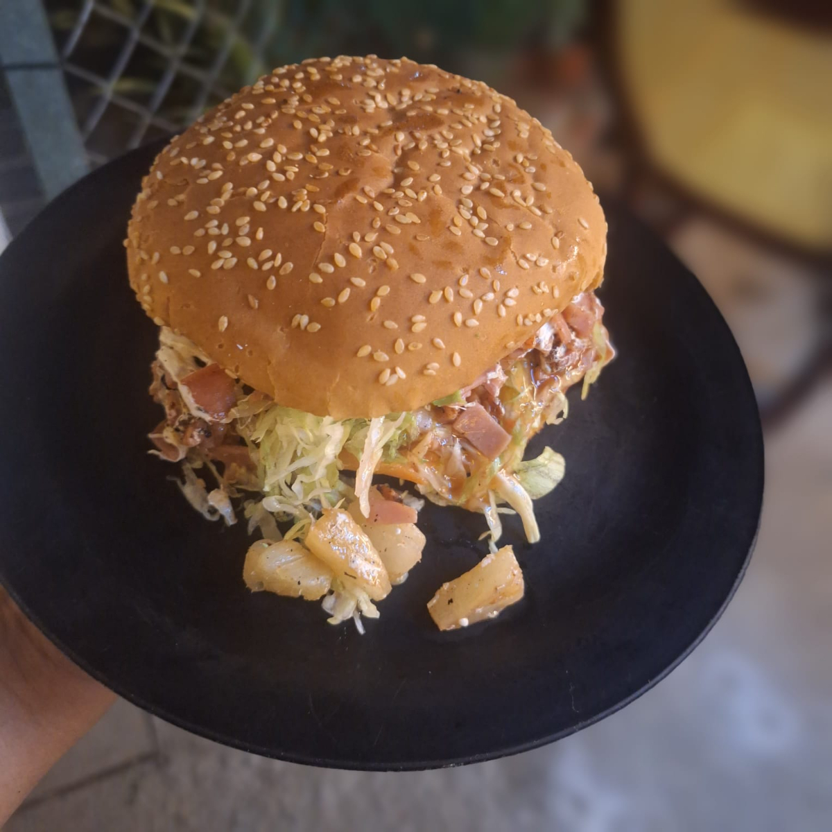 Carne 100% casera, rebanada de jamón, queso amarillo, jamón y tocino picado, piña, queso oaxaca, mayonesa, catsup, mostaza, aguacate, lechuga, tomate, cebolla