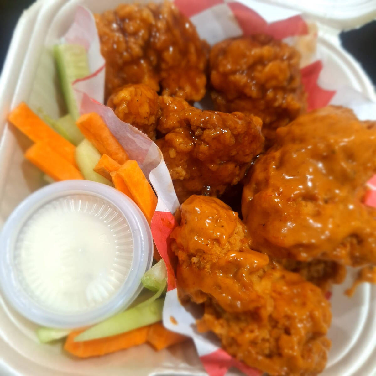 8 piezas de Boneless de pollo, 2 salsa a elegir, guarnición zanahoria, apio, porción de ranch
