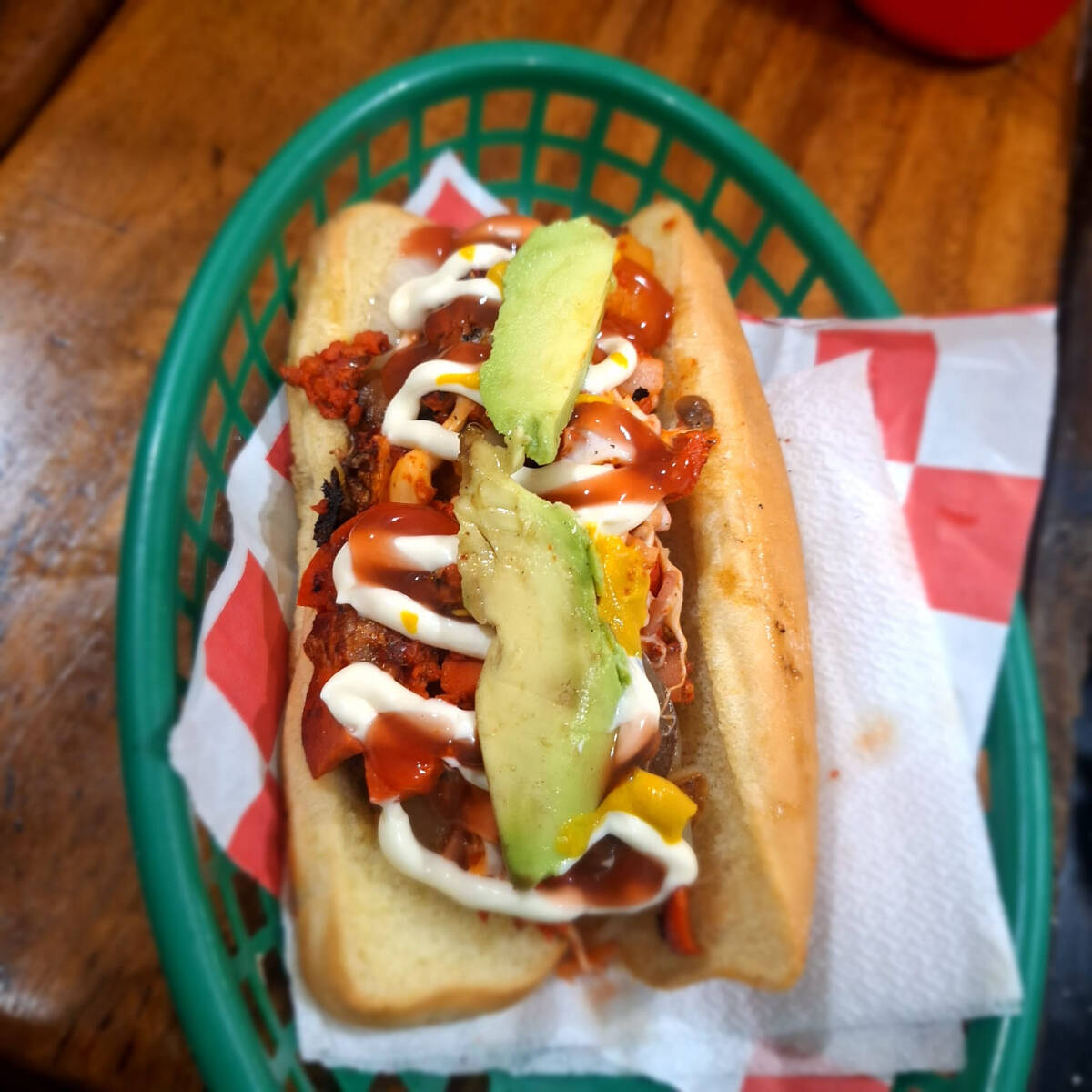 Salchicha de pavo, mayonesa, catsup, mostaza, cebolla caramelizada, jamón y tocino picado, queso Oaxaca, aguacate