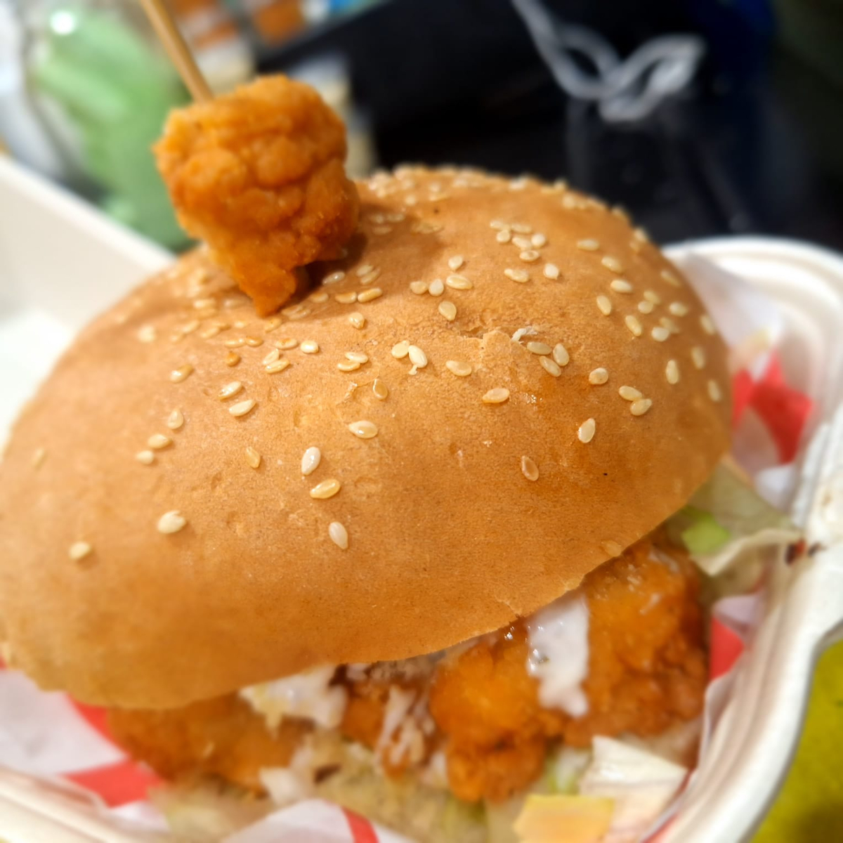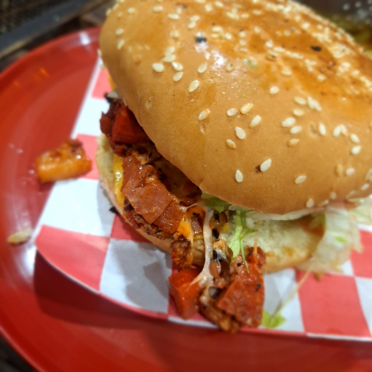 Boneless de pollo, lechuga, tomate, cebolla caramelizada, mayonesa, catsup, salsa a elegir
