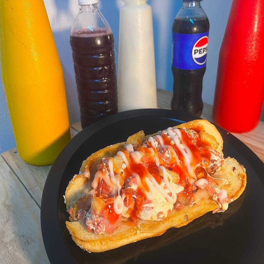 Pan jumbo, carne de res, salchicha, jamón, queso, jalapeños asados, chorizo, lechuga y cebolla.