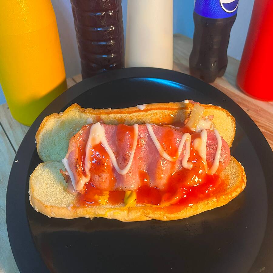 pan hotdogs,salchicha,tocino,cebollita caraelisada,catsup,mayonesa,mostasa,jalapeños