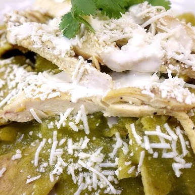 Chilaquiles verdes no muy picantes con crema, queso y cebolla