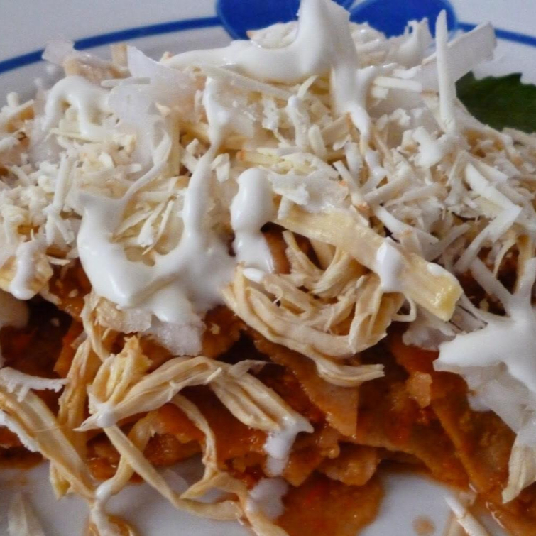 Chilaquiles rojos no muy picantes con crema, queso y cebolla