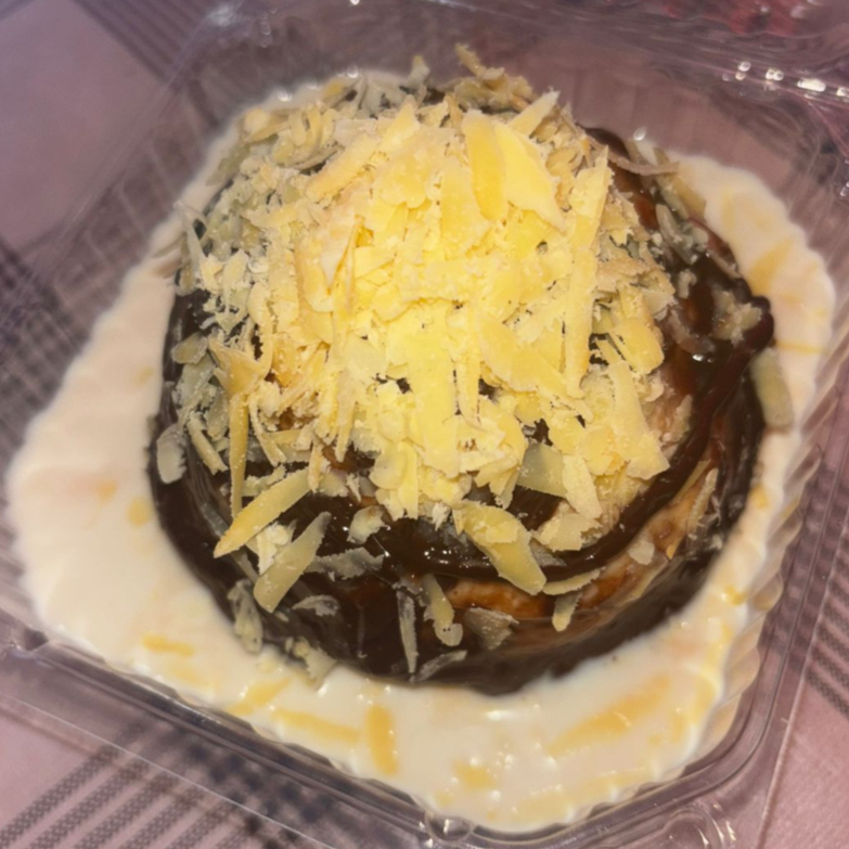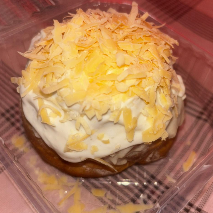 Por dentro , canela , mantequilla y azucar mascabada por fuera glaseado de queso crema con toppig de queso de bola