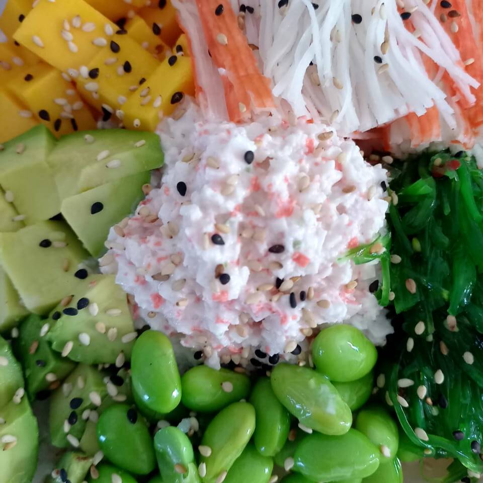 Tazón con cama de arroz sushi, ensalada kanikama, edamames, pepino, aguacate, tampico, zanahoria y ajonjolí