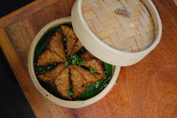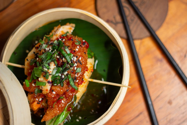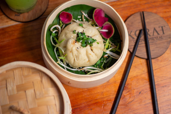 Pan al vapor con sirloin tempura, salsa teriyaki, acompañado de negi, ajonjolí, alga nori.