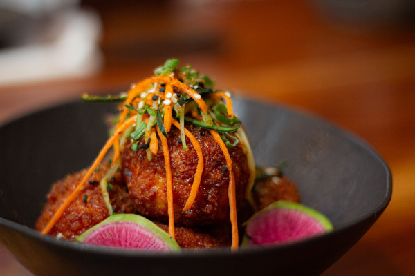 BONELESS DE PECHUGA DE POLLO CON SALSA COREANA PICANTE, ACOMPAÑADOS DE FURIKAKE, AJONJOLÍ, ZANAHORIA Y PEPINO RAYADOS