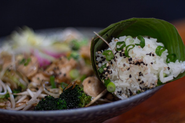 Arroz jazmín con azafrán salteado con mantequilla, huevo, cebolla cambray, col de bruselas, brócoli, albahaca, elote, calabaza, poro, cacahuate, especias orientales, chile serrano y Thai, acompañado de nuestra salsa de limón-pescado, (500 gm).