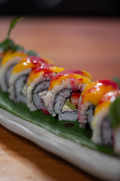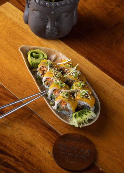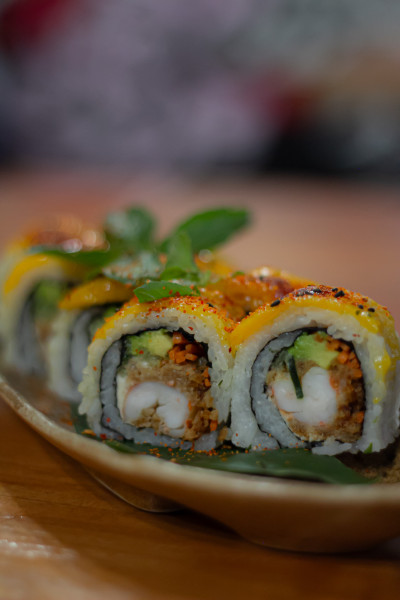 Maki con MANGO, queso crema, aguacate y camarón tempura.