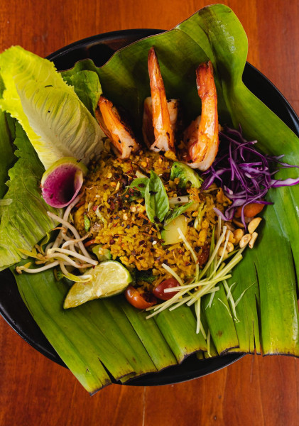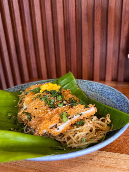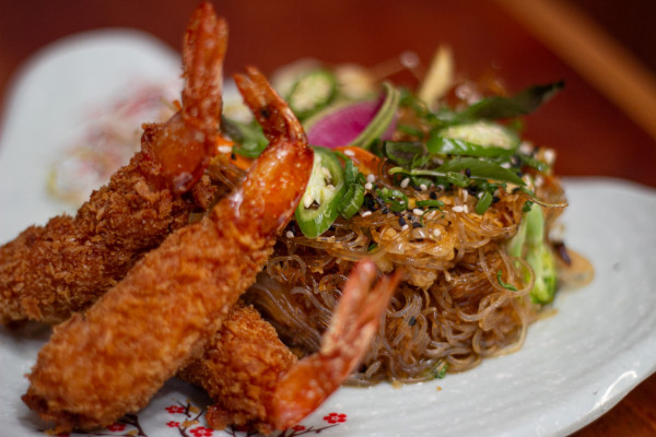 Noodles de pasta de huevo en salsa de la casa con chile Thai, albahaca, cebolla cambray, ajo, jengibre, huevo, limón y proteína en tempura.