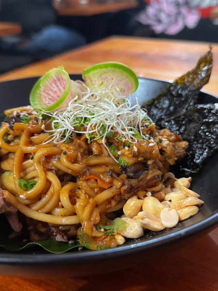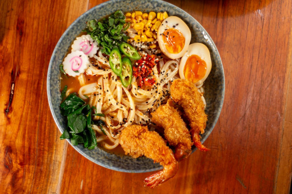 Una versión única de ramen con el inconfundible toque de KORAT Cocina Oriental. Fideos tradicionales en un caldo cremoso y especiado con curry massaman, cacahuate, coco y hierbas aromáticas. Acompañado de vegetales salteados al wok y tu elección de proteína