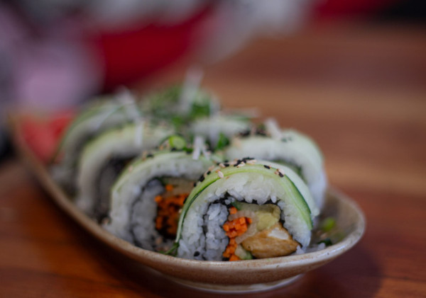 Omaki con pepino, zanahoria, tofu, col morada, aguacate.