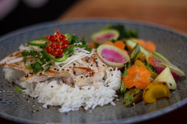 Pollo frito acompañado de ensalada de vegetales y arroz jazmin al vapor y salsa tonkatzu + LIMONADA GRATIS