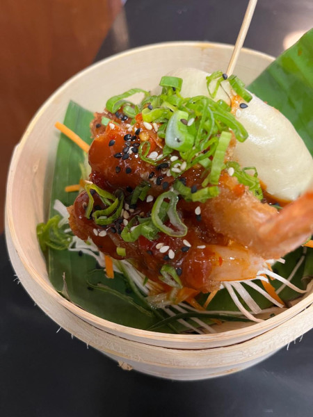 Pan al vapor con camarones capeados en tempura y salsa agripicante, acompañado de ensalada de algas.