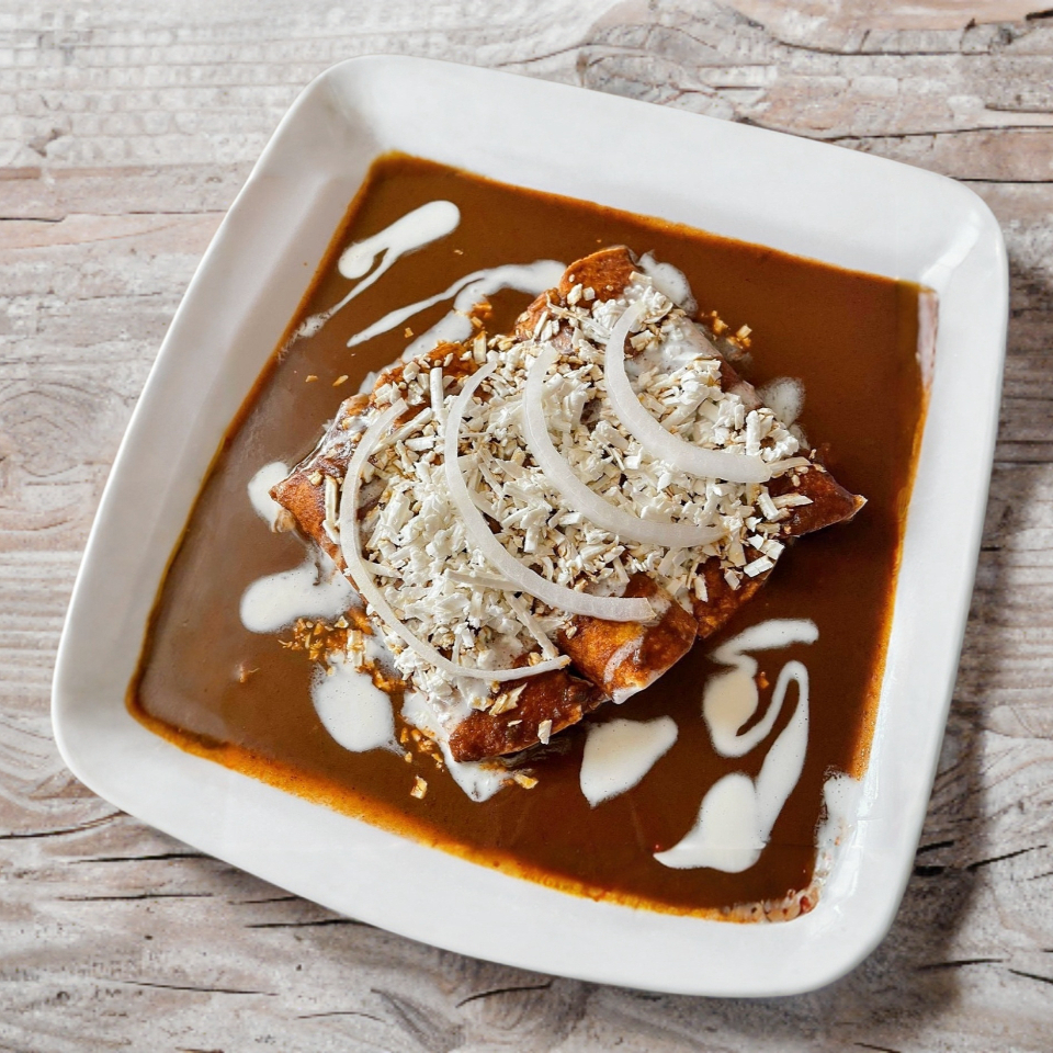 4 piezas de tortilla dorada rellenas de pollo, bañadas en salsa de su preferencia, con crema y queso espolvoreado.
