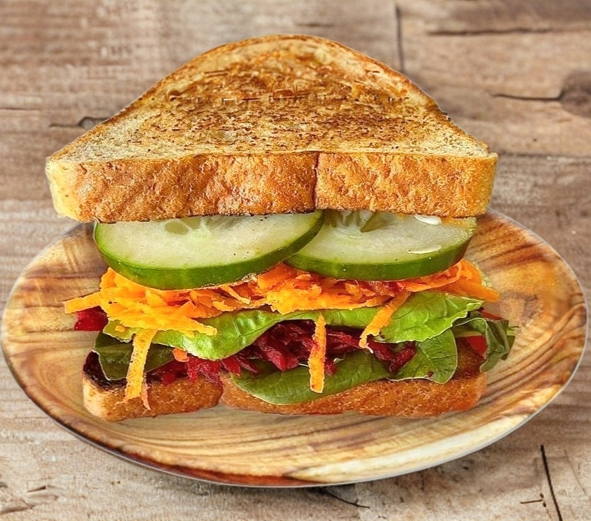 Delicioso sándwich relleno de espinaca, zanahoria rallada, betabel rallado, queso panela, lechuga, pepino y un toque de mayonesa.