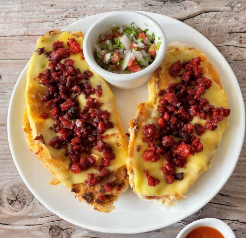 2 mitades de bolillo con frijol refrito, queso manchego y pico de gallo. ¡Añade tu ingrediente favorito!