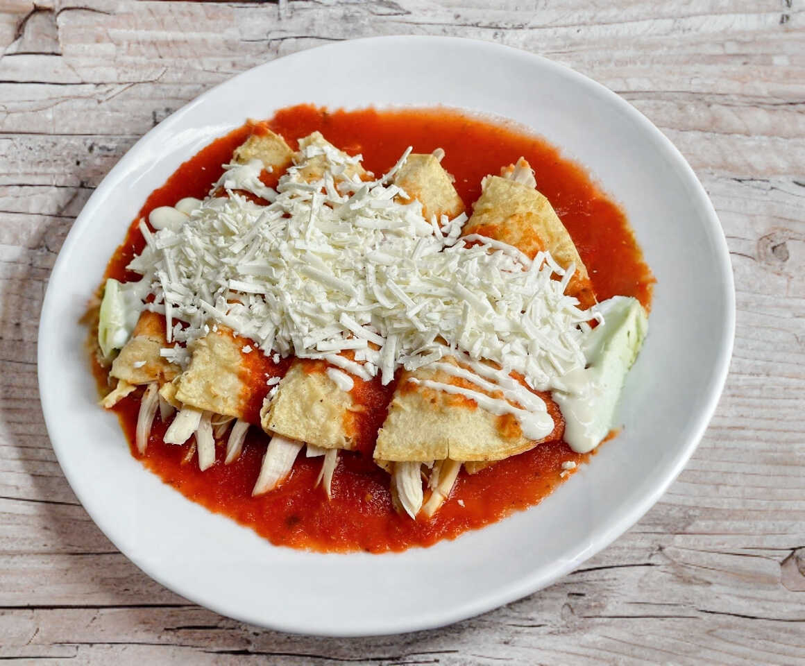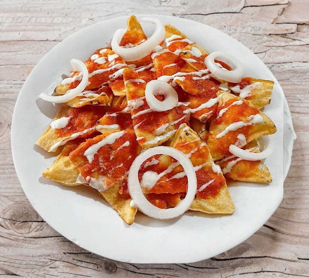 Trozos de tortilla frita, bañadas en salsa roja o verde con crema y queso espolvoreado, más tu ingrediente favorito.