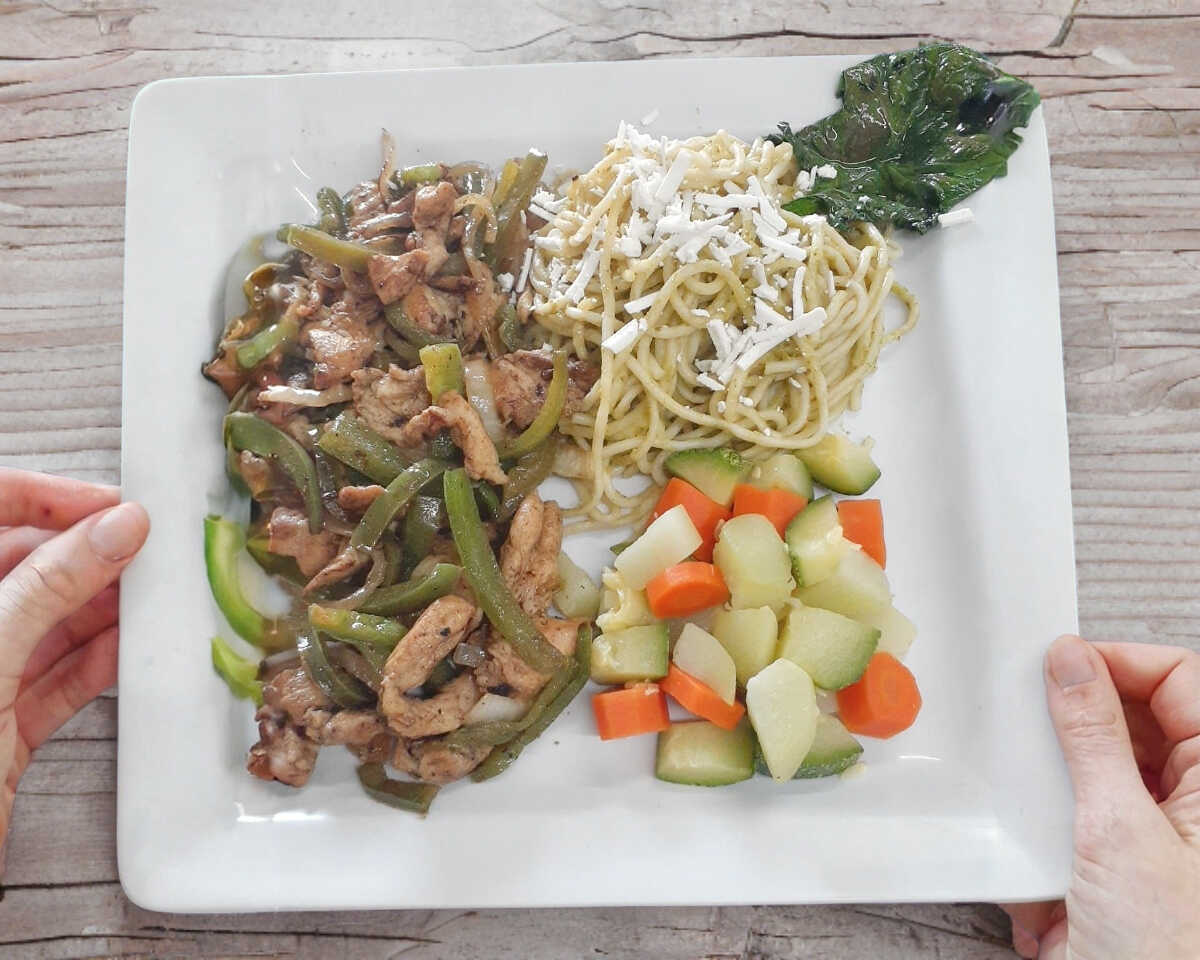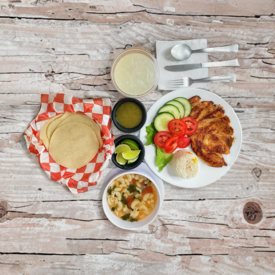 Entrada, plato fuerte, 2 guarniciones y agua.
