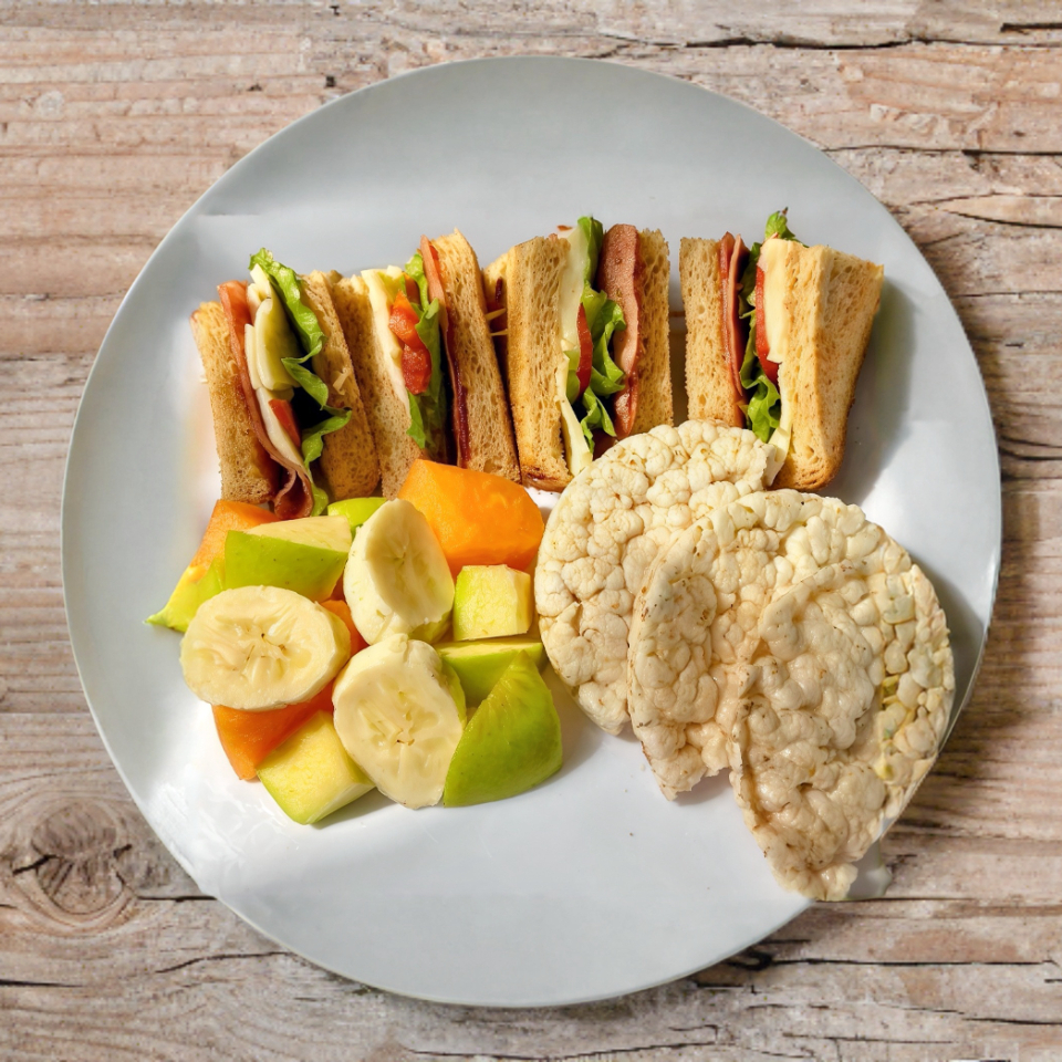 Desayuno nutritivo con sándiwch de jamón de pavo, queso panela, lechuga, jitomate y un toque de mayonesa, acompañado de tortas de arroz integrales y fruta (100 gr de fruta)..