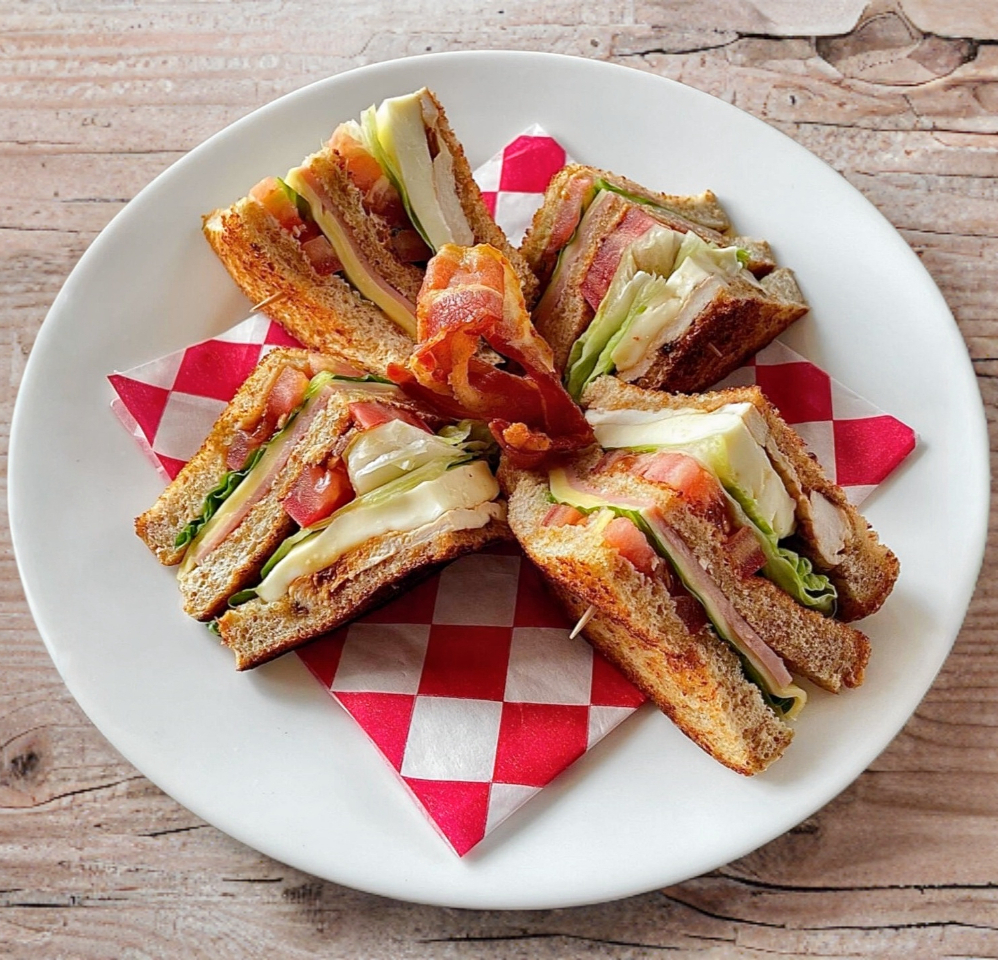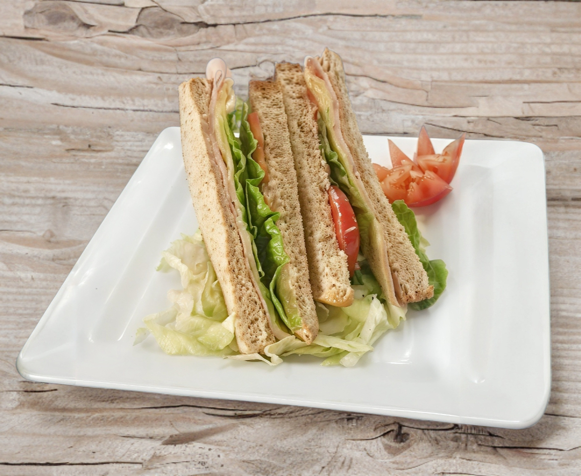 Sándwich triple con pan integral, relleno de jamón de pavo, queso panela, manchego, pechuga a la plancha, lechuga, jitomate, mayonesa y tocino dorado.