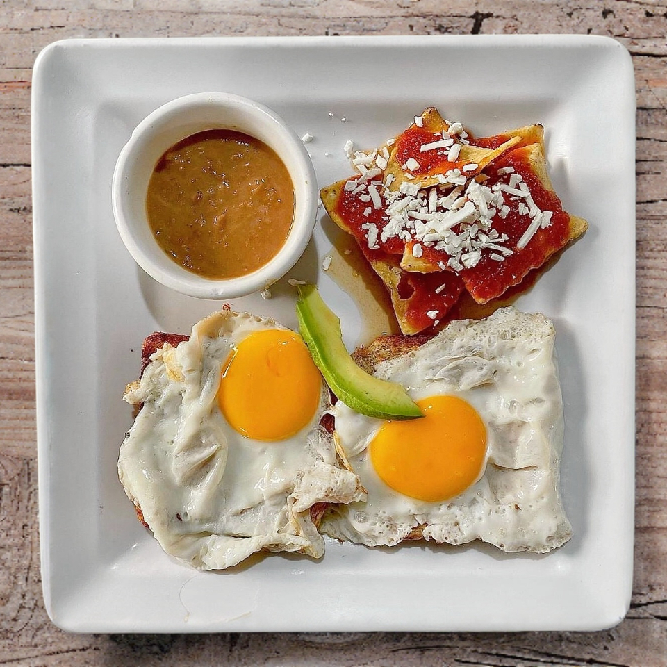 2 piezas de huevo estrellado sobre tortilla frita, bañados en salsa roja, acompañados de frijol y chilaquiles.