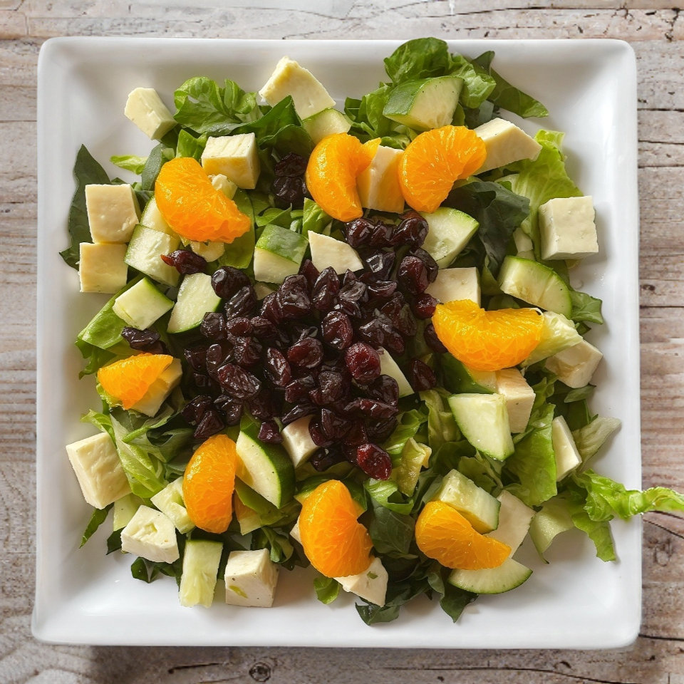 Base de lechuga italiana, con pechuga a la plancha, queso panela, mandarina y arándano. (580 gr) aprox.