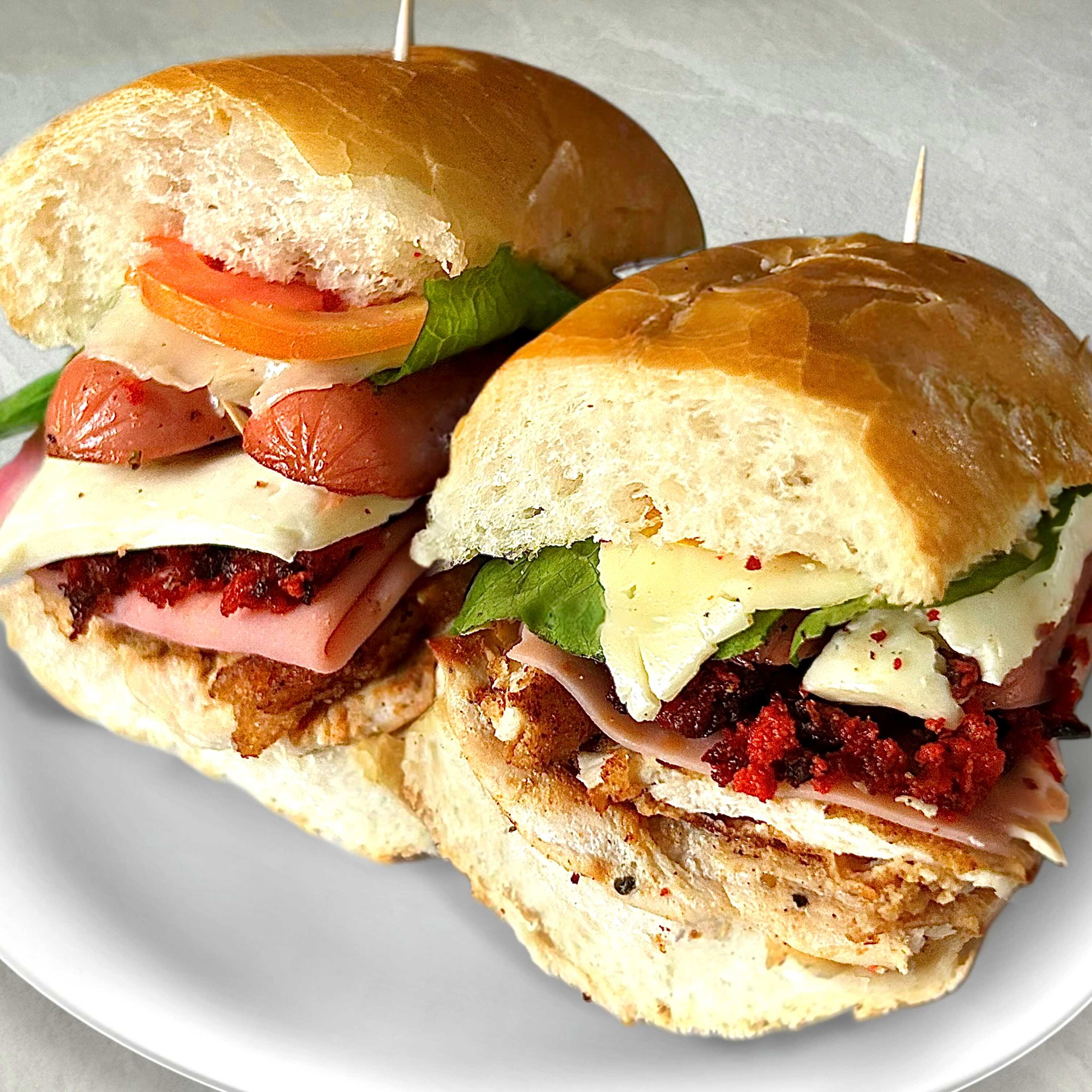 Combinación irresistible de frijol refrito, jamón de pavo, queso panela, manchego, milanesa de pollo, pechuga a la plancha, salchicha, chorizo, complementado con lechuga, jitomate y mayonesa.