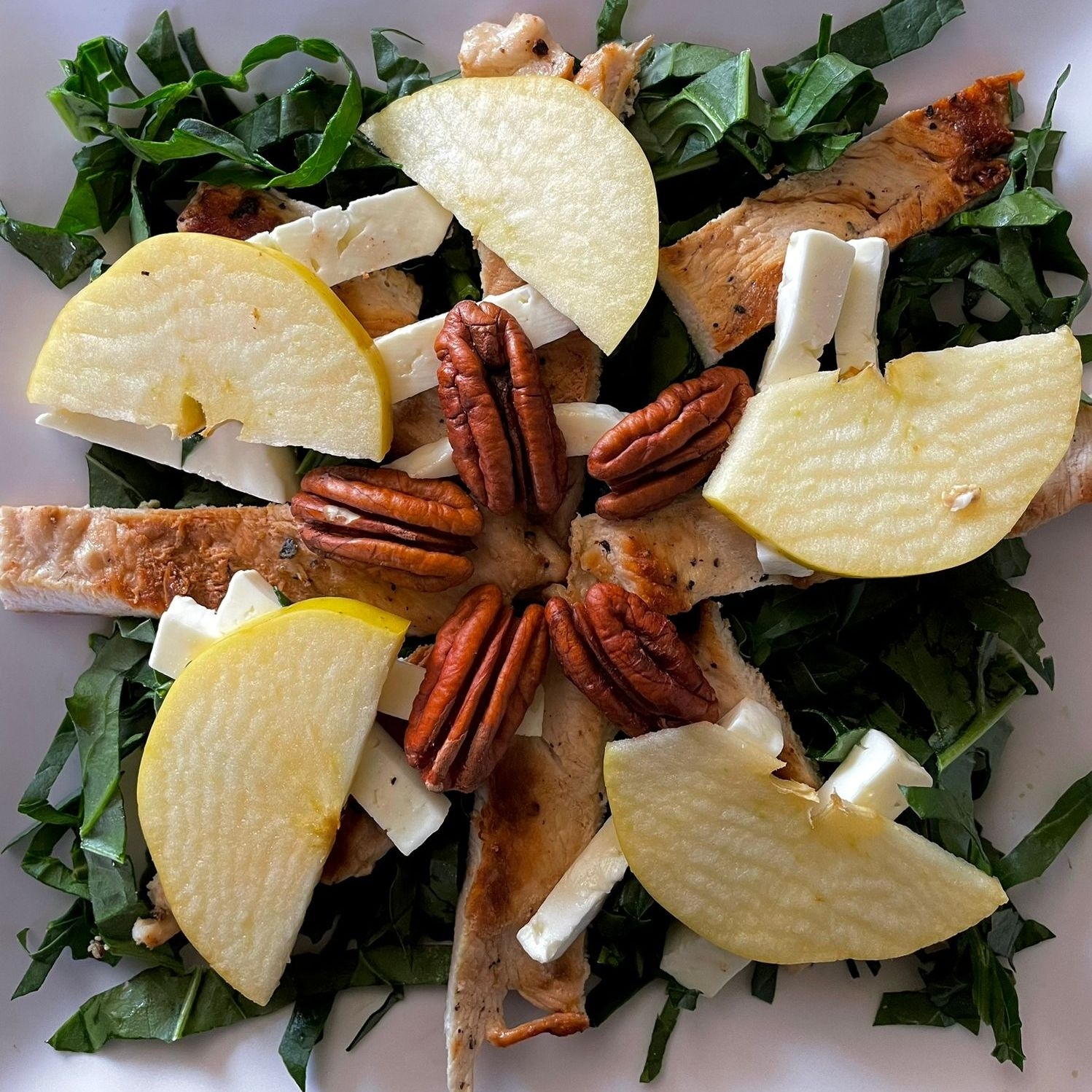 Base de espinaca, con pechuga a la plancha, queso panela, manzana y nuez. (400 gr) aprox.