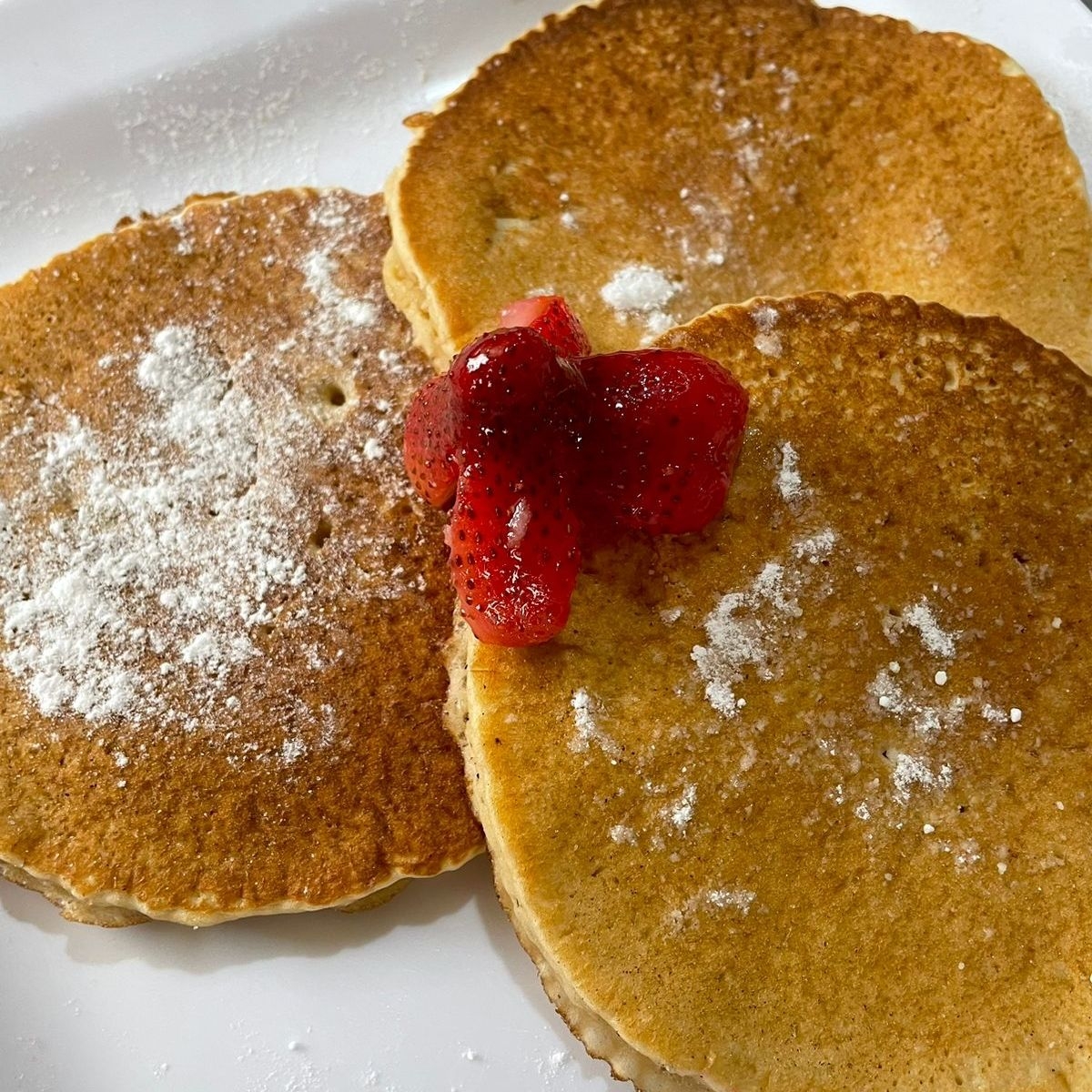 Desayuno completo con hot cakes, huevo revuelto, tocino, papa hashbrown y una porción fresca de fruta de temporada.